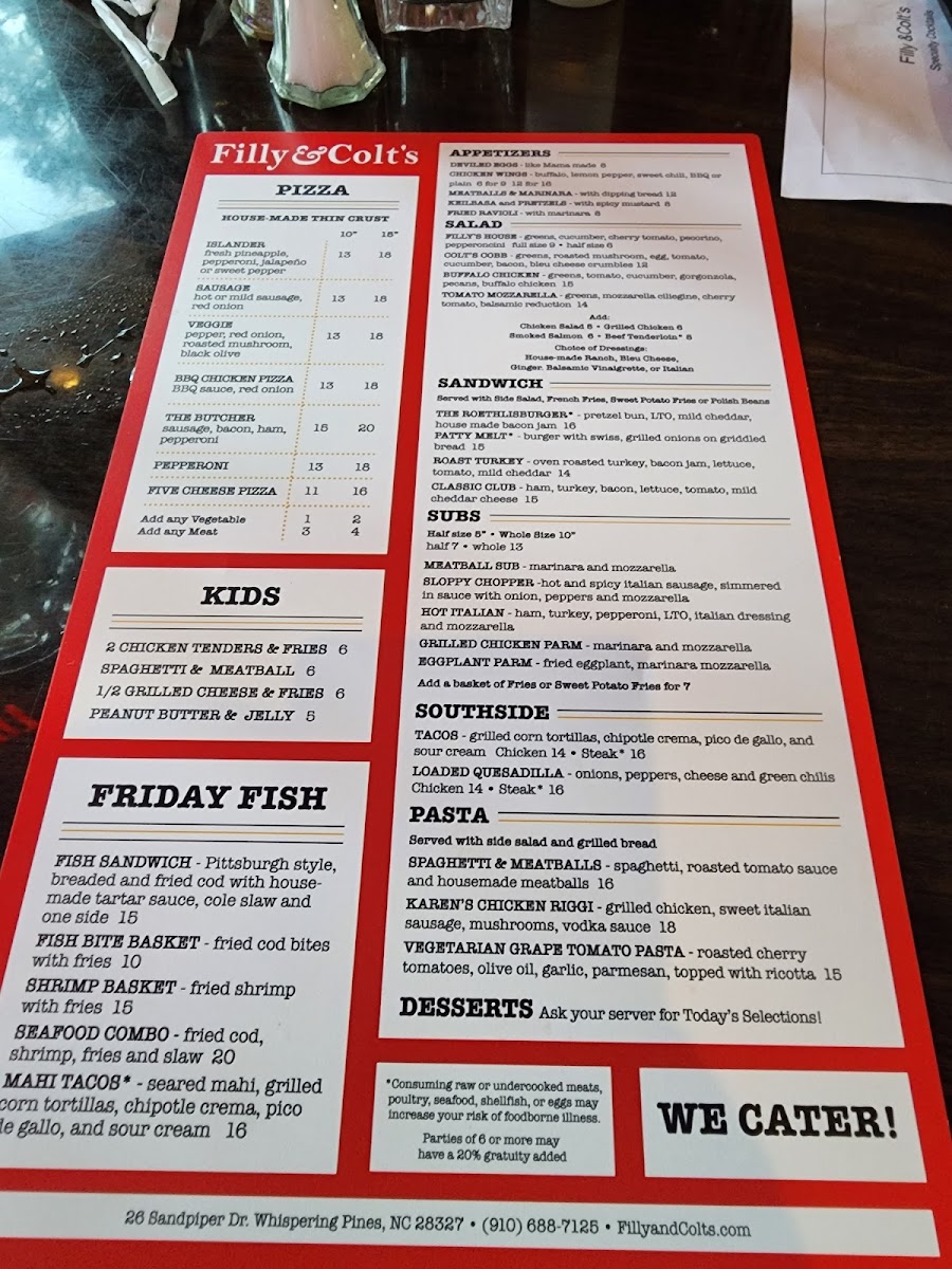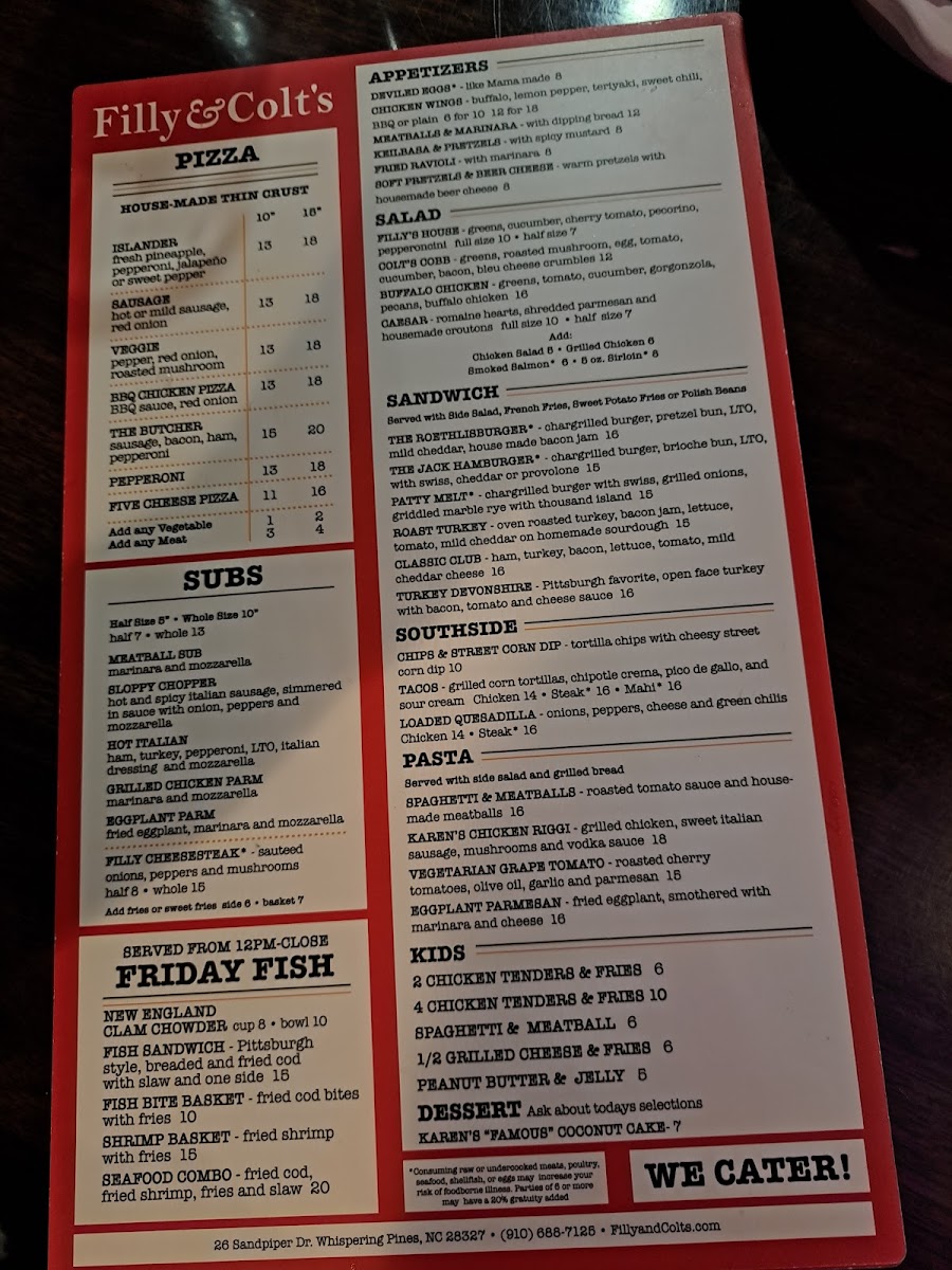 Welcome to Filly & Colts, a hidden gem nestled at 26 Sandpiper Dr, Whispering Pines, NC. This charming eatery captures the essence of community dining with its inviting vibe, clean decor, and outstanding service. The menu offers a delightful assortment of dishes, from the expertly cooked Linebacker breakfast to simple yet satisfying sandwiches and burgers.
