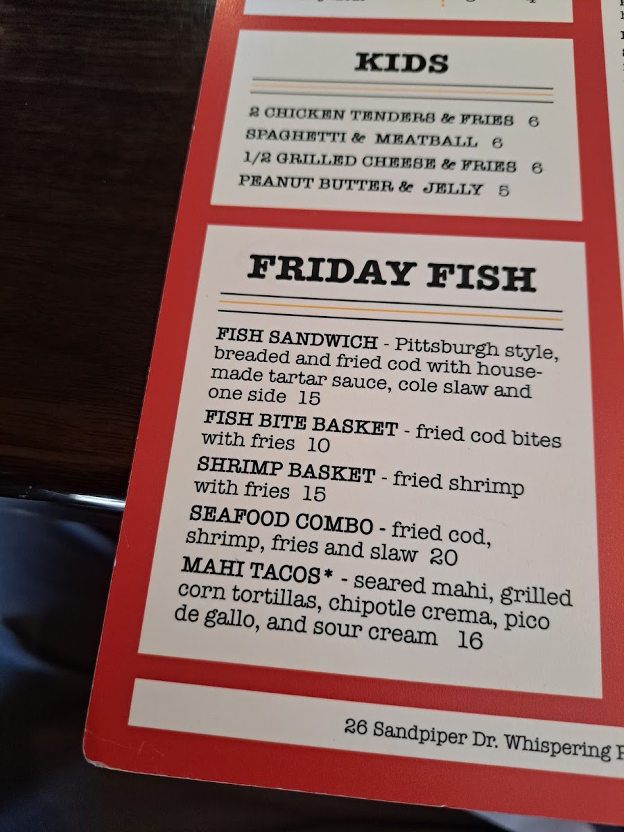 breaded and fried cod with house made tartar sauce. served with slaw and your choice of side : fries, sweet potato fries, polish beans or side salad